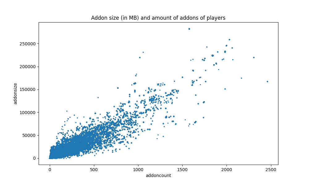 As the above scatter chart shows, most of the players have less than ~250 addons which are, combined in size, less than ~25GB in size.