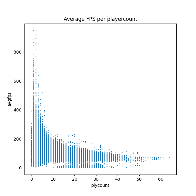 The above graph shows the average fps of every player on the server combined on the Y axis and the amount of players on the server on the X axis.